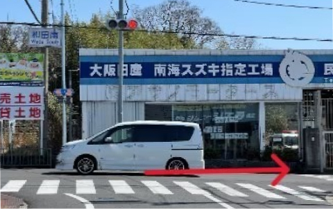 約150m先を左折し、オークワ和泉納花店駐車場にお進み下さい